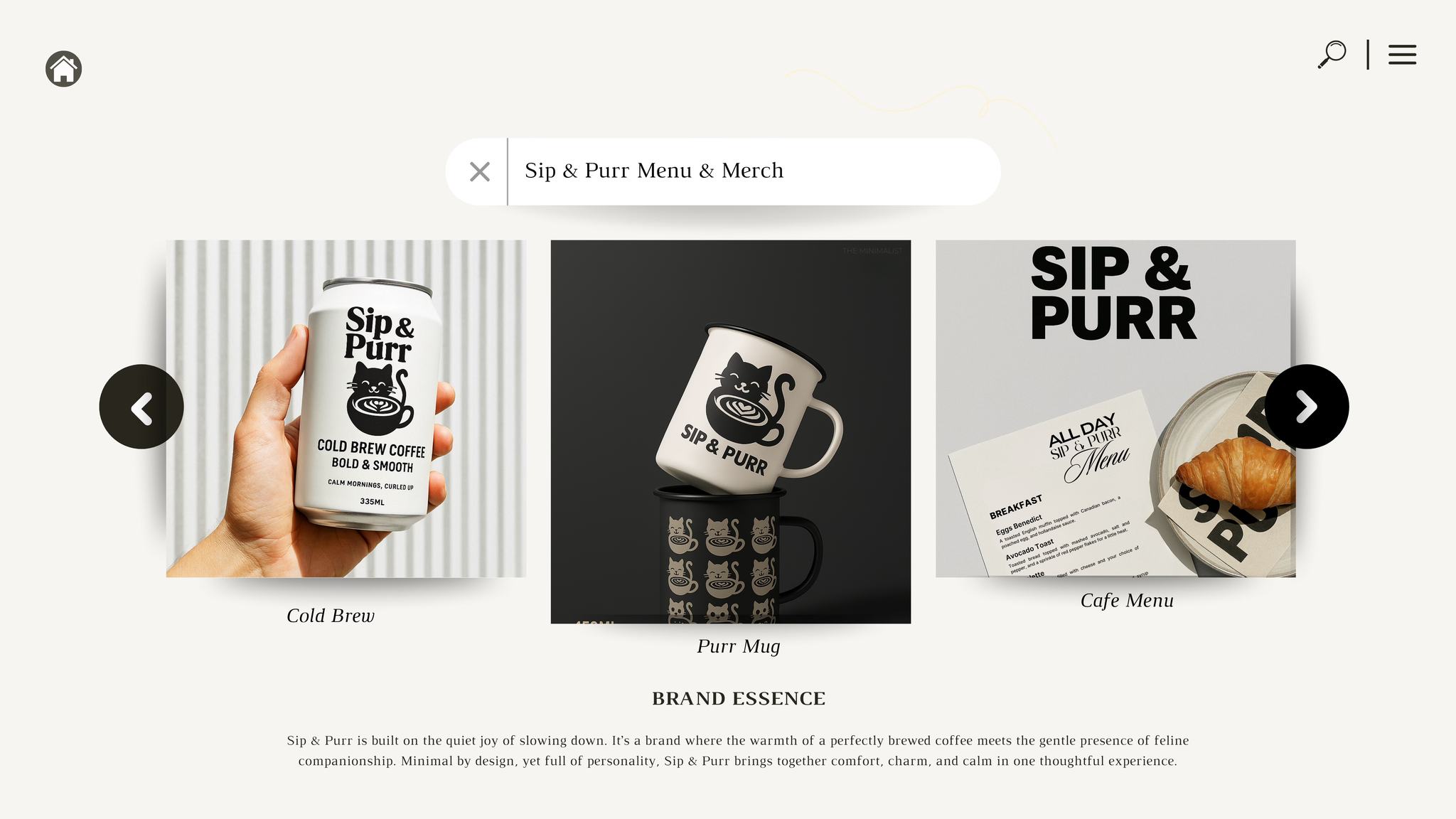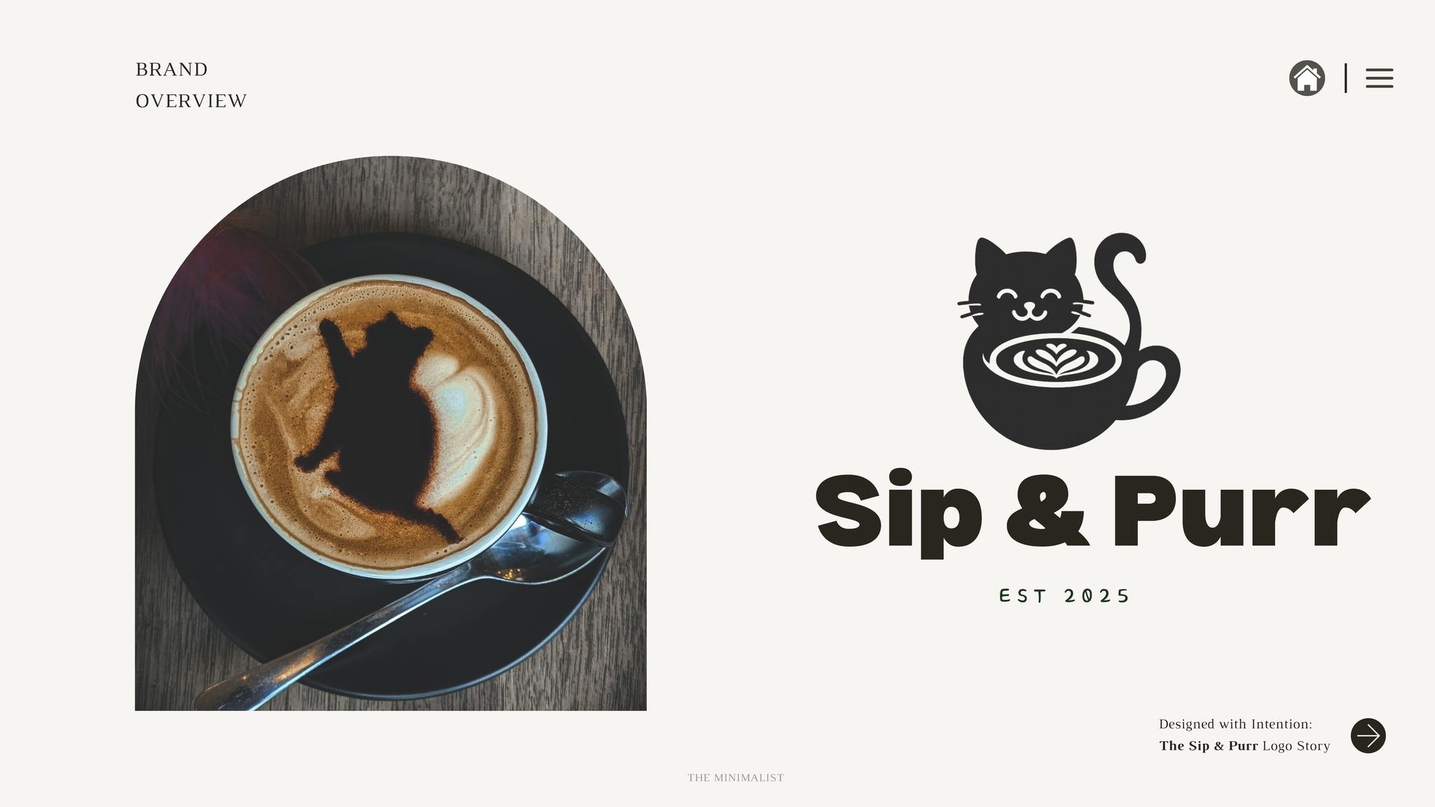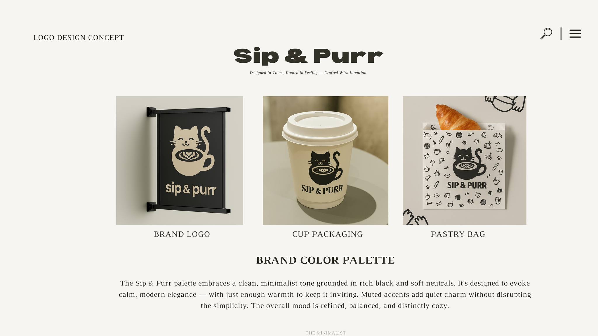 Sip & Purr brings together slow coffee culture and quiet character After styling the logo and identity, we brought the visual story to life through every detail: product packaging, cozy merch, a minimalist menu, and a softly lit interior space designed to feel like a deep breath..